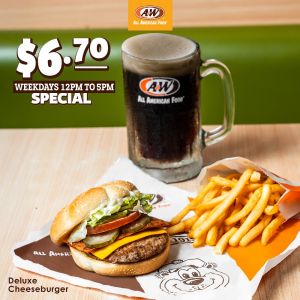 A&W Singapore $6.70 Special: Enjoy a main (Coney Dog/Burger), Fries & Root Beer for just $6.70! Valid Weekdays 2pm-5pm at selected outlets. Counter orders only.
