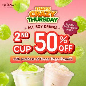 It’s Crazy Thursday at Mr Bean! Get 50% OFF your 2nd cup of soy drink with every purchase of Green Grape Soymilk. Available every Thursday at outlets islandwide.