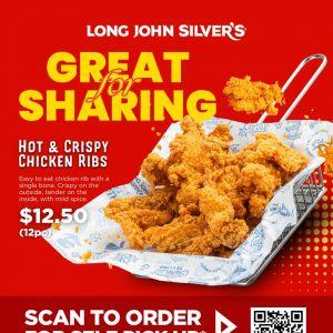 Snack alert! Enjoy Long John Silver's Hot & Crispy Chicken Ribs from $4.50. 12pc sharing set for $12.50. Pre-order online at 5 selected locations. Shiok!
