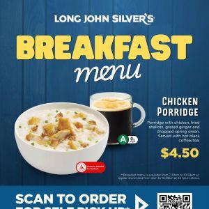 Start your morning right with the Long John Silver's Breakfast Menu! Enjoy a comforting bowl of Chicken Porridge with hot coffee or tea for only $4.50.