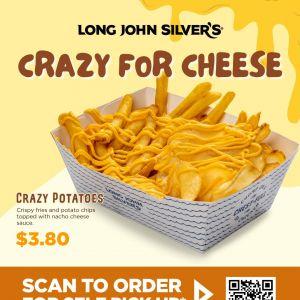 Discover the newest addition to the Long John Silver's Menu! Enjoy the new Crazy Potatoes drenched in nacho cheese for only $3.80. Order online for self pick-up.