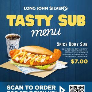Decision fatigue? Grab the Spicy Dory Sub at Long John Silver's for only $7.00 with a drink! Available for self-pickup at selected locations. Order online now!