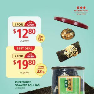 Discover the latest Bee Cheng Hiang Promotion! Enjoy huge savings on the Puffed Rice Seaweed Roll and get a free Cereal EZ Mini Crunchies with $50 spend.